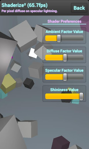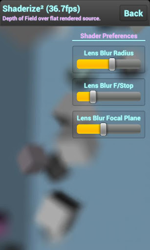 Demo application for testing and showing different OpenGL ES 2.0 GLSL shaders. These include depth of field, bloom and per pixel lightning to name a few. Rendering may be a bit slow on some devices while newer ones shouldn't have problems with rather simplistic scene used for testing purposes.