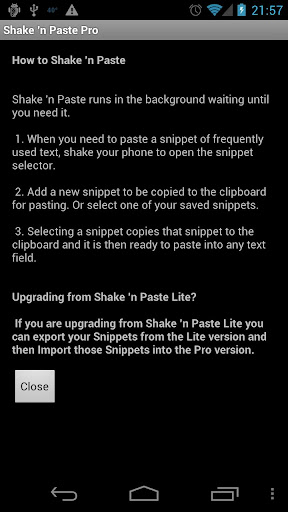 ☆ Ability to turn off the Shake 'n Paste background Service and run the application directly from the app icon or Notification Bar.