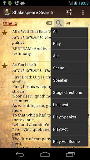* Powerful search system. Search by play, act, scene, speaker, line, etc. Perfect for studying