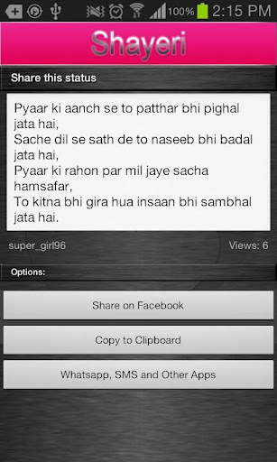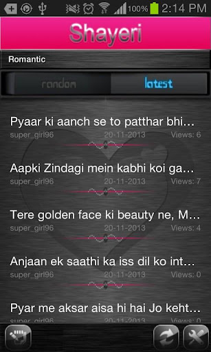 In this Shayeri App we collected the best ever shers popular around the world. This app does not only expresses the feeling of romance & love, but also core pain of a badly broken heart. By this app, you can share the shayeri via SMS, Facebook, Whatsapp, Bluetooth, Messaging, Orkut, MySpace, Instagram, Tumblr, Hi5, Twitter, Google Plus, Flipboard, Badoo, Viber, Kik Messenger, ChatOn, Friendcaster, WeChat, Line Messenger, Skype, eBuddy, Tango, LinkedIn, Pinterest, Tagged, Hike, Gmail, Yahoo and all other leading Email Service Providers.