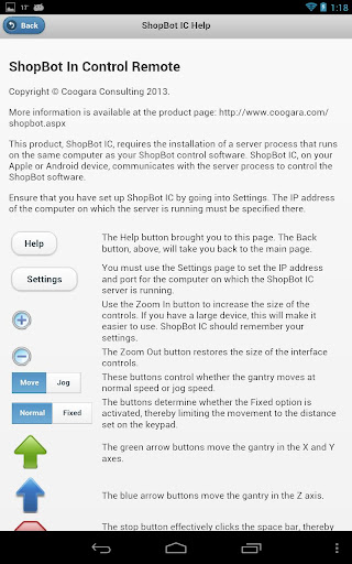 The ShopBot IC (In Control) Remote application allows you to operate your ShopBot 3 software using your Android device. Make all of your preparation steps prior to cutting using your Android over a wireless connection. Move in X, Y and Z, move home, zero X, Y and Z and so on.