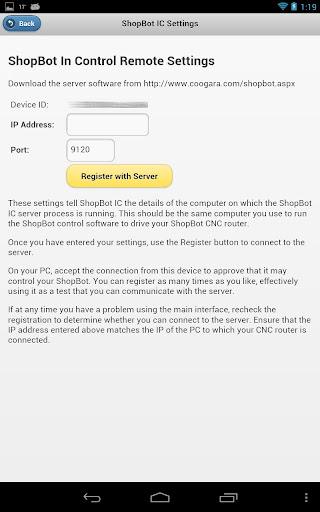 Your Android device communicates with the ShopBot software via a server process. You need to download this separately and install it on the computer to which you have the ShopBot connected.