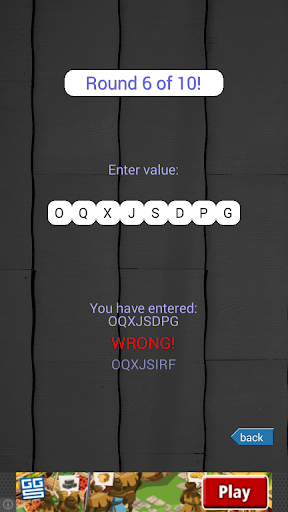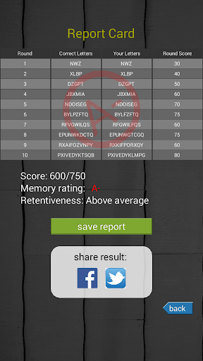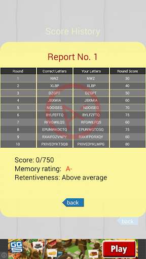 In this memory game, a few letters will flash on your device for 3 seconds. Your job is to write down as many letters as you can remember after they disappear. At the end, a report is generated that evaluates how good your short-term memory is at retaining information.
