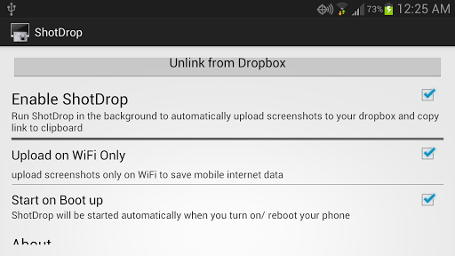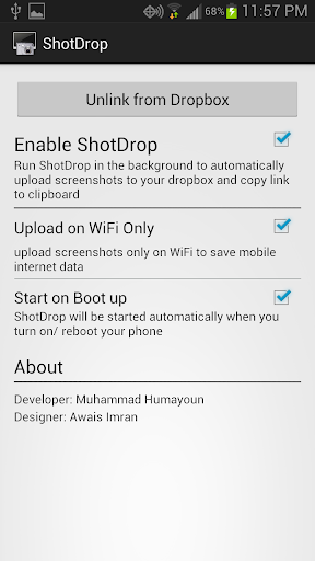 - Settings available: upload screenshots over WiFi only (for saving mobile data), and automatically starting ShotDrop on system bootup