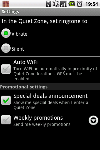 On any given place with WiFi coverage, you can configure ShushMe to remember specific SSIDs (wirless network names), and enter silent or vibration mode whenever you enter the vicinity of that network.