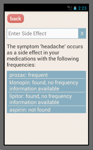 Find the side effects of all your medications, without visiting multiple websites. For a given symptom, find out which of your medications could have that side effect.