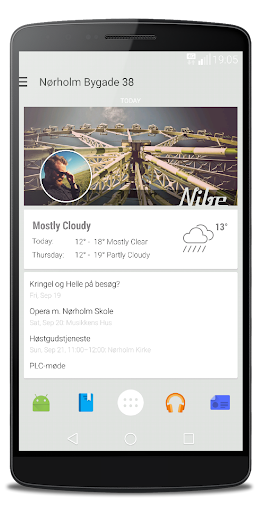 Swipe right for Gnow-ish agenda page with exact adress locatio, weather info, forecast and calendar agenda.