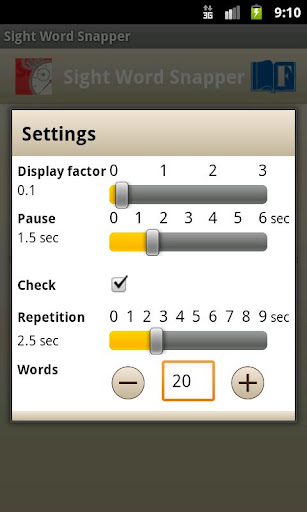 Sight Word Snapper is an application which helps you to increase your reading speed. You will learn to recognize “sight words” and no longer be dependent on reading words letter by letter. This is an efficient technique and reading speed will increase dramatically when you have learned high frequency English words.