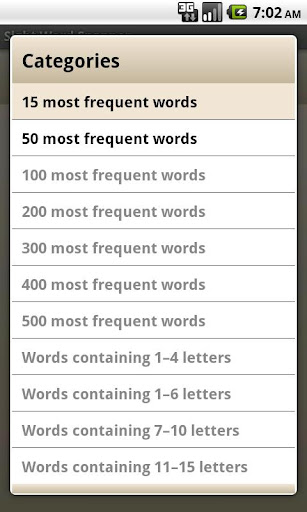 The free version provides the 50 most common words in English newspapers. The full version provides access to the 500 most frequent words in English newspapers. You will also find exercises training words consisting of 1–6, 7–10 and 11–15 letters.