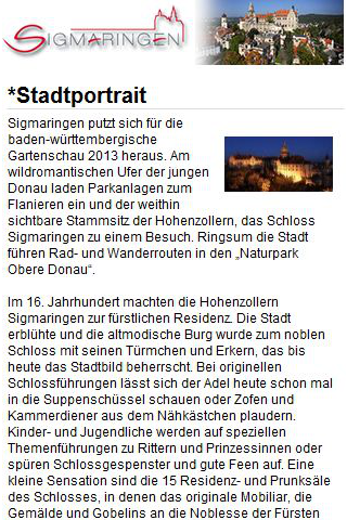 Stadtinformation und Branchenbuch für die Kreisstadt Sigmaringen, mit aktuellen Terminen, Nachrichten, Wetter und weiteren Funktionen.