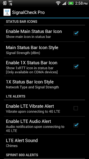 SignalCheck can also notify the user with optional audio and/or vibrating alerts when a 4G LTE connection is discovered. This is handy for users traveling in new cities, or if your carrier's network is being upgraded -- know immediately when you have a high-speed connection! Sprint users can also enable alerts to notify them when they connect to 800 SMR.