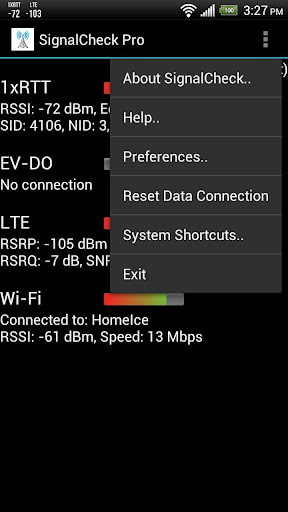 SignalCheck allows users to check the true signal strength of their connections. Unlike the standard Android signal bars, which typically only display the 1xRTT (voice and low-speed data) signal strength, SignalCheck will show you detailed signal information about all of your device's connections, including 1X, GSM, EV-DO or eHRPD (3G), LTE (4G), and Wi-Fi.