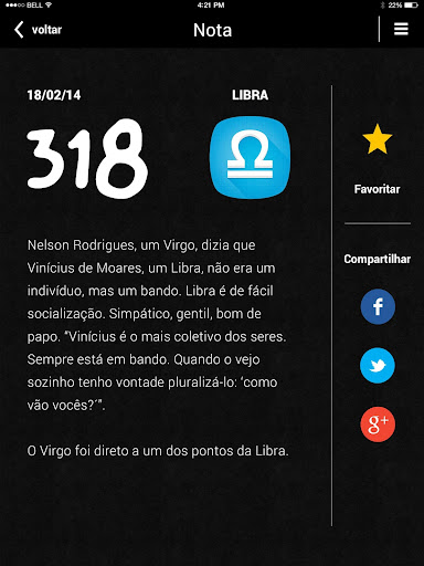 Tenha no seu celular ou tablet e passará a receber notas astrológicas. Você pode escolher receber notificações apenas do seu signo solar e/ou sobre os demais signos, sem restrição. O que você terá à disposição é um texto que procura abranger todos os aspectos sobre os doze signos do zodíaco, desde o que a tradição nos informa a respeito, quanto uma abordagem dos signos ao modo Saturnália – Astrologia & Cidade, isto é, através de imagens, metáforas, aforismos, urbanidade e linguagem poética para ensinar e ilustrar o tema com maior precisão. Este é o Volume 1 do Signozine by Saturnália, que comportará 150 a 200 notas astrológicas sobre cada signo do zodíaco. Tenha já no seu celular ou tablet e compartilhe com seus amigos. Seja bem-vindo!