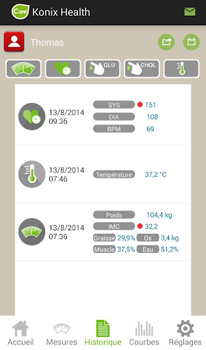 Vous pourrez enregistrer vos diverses mesures relevées par la balance intelligente, le tensiomètre, le thermomètre et/ou le glucomètre/cholestéromètre.