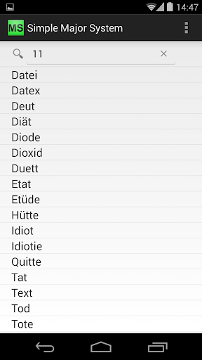 Wer eine Liste nach dem Major System bastelt, weiß das es mit manchen Zahlenkombinationen schwierig wird Wörter zu finden. Diese App hilft ihnen dabei, schnell alle in Frage kommenden Wörter zu finden. Dazu können Sie auch verschiedene Wörterbücher auswählen.