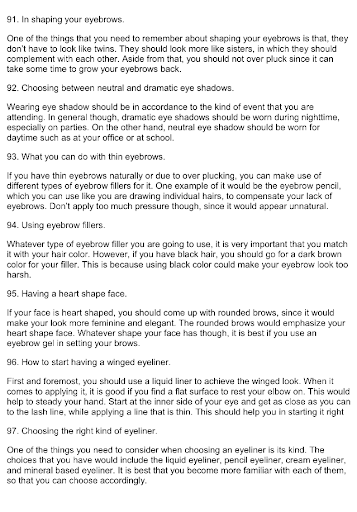 Simple Makeup Tips will teach you things you might not have heard of or have forgotten about. It's packed with 100 great makeup tips and tricks that you can start using immediately - REGARDLESS OF YOUR EXPERIENCE LEVEL!