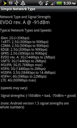 Simple network type identification app. Displays the current cellular network type (2G, 3G, 4G etc.) and signal strength. Useful in determining the meaning of the ambiguous 3G network icon. This app does not send us any information. Permissions required for advertising banners ONLY.