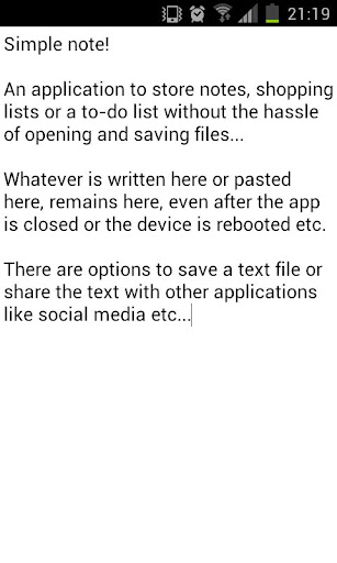 Open Simple Note and type, the text is saved when the back button is pressed, and will be reloaded automatically when Simple Note is opened again.