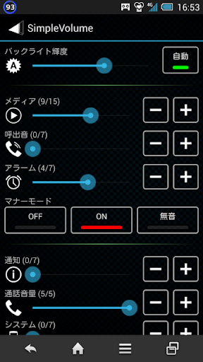 バックライトの輝度、各種音量、マナーモードを設定できます。