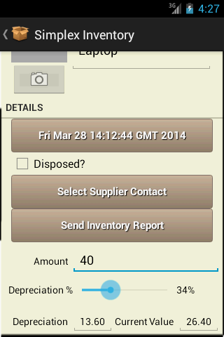 Application for keeping an updated list of your inventory, key features include taking a photo of your inventory, sending a report and selecting a supplier contact from your contact list. Simplex inventory also includes a feature for calculating depreciation for your inventory.