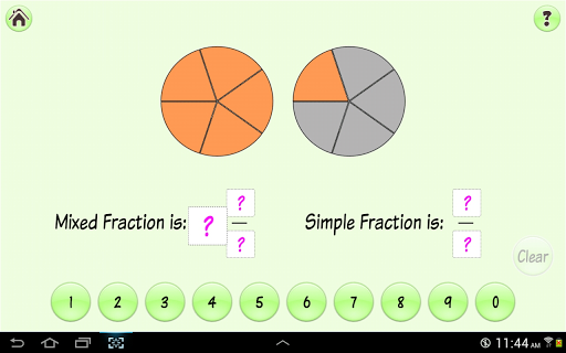 2. Mixed Fractions: You are presented with circles and a fraction of a circle, you will have to put in the correct whole number, numerator, denominator and the equivalent simple fraction's numerator and denominator. Since you are asked to put in the number rather than choosing from multiple choices, guessing is minimized.
