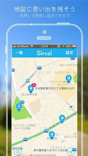 Mark any spot, and you can set up a shopping or to-do list, and Sirusi will remind you with an alarm when you are near the location.