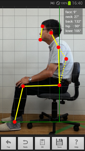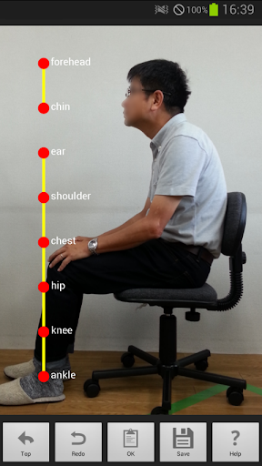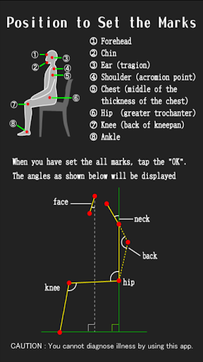 Set the marks at the positions which are forehead, chin, ear, shoulder, chest, hip, knee and ankle, and tap the "OK" . You can get the angles as shown below.