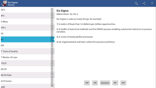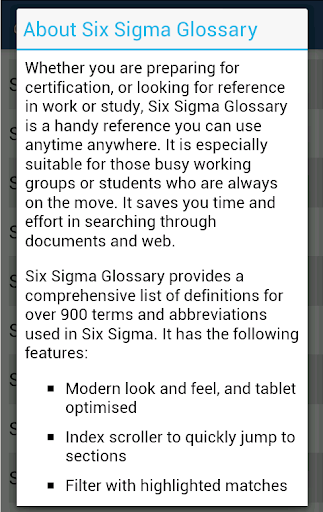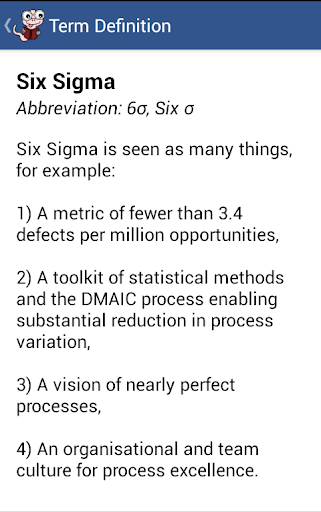 Confused by Six Sigma terms? Want to find out the meaning in seconds? Six Sigma Glossary is a simple mobile reference to help you quickly find the meaning of Six Sigma terms and abbreviations.