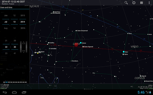 Detailed additional information is available for every celestial object (fixed star, deep sky object, planet, moon, sun, meteorite shower). The information of the Bright Star Catalog and the Washington Double Star Catalog is made available for fixed stars. Additionally, users can add notes and links for every object.