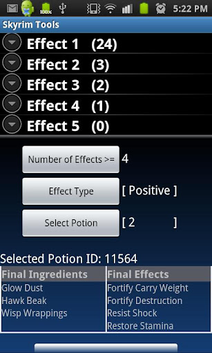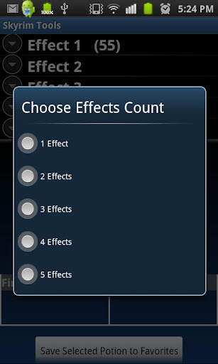 Click "Alchemy by Effect" to go to that section. Start by setting the effect type and effect count you want to achieve. The lists will then only present items that can meet these criteria. Then select effect 1, then 2 , then 3 and so on. As you do this, an internal list of potions is narrowed which have the selected effects. To view these potions at any time, click "Select Potion". Selecting one will show you the ingredients. When satisfied with your selection, you can save it to your favorites and optionally give it a name to easily remember it by.