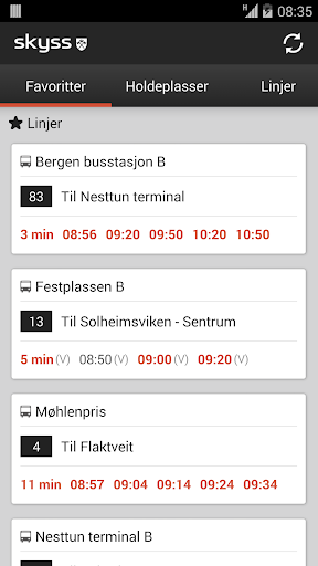 Avganger med sanntid er markert med rød farge, og viser når bussen er beregnet å kjøre fra din valgte holdeplass.
