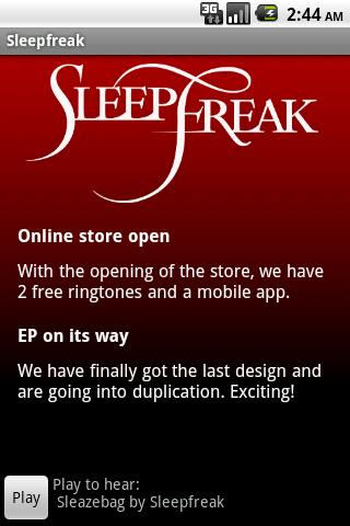 Stay up to date on Sleepfreak news and events. Simple news reader application that grabs news from the Sleepfreak bands website, and presents it in a short form. Also includes a song from the latest EP.