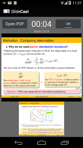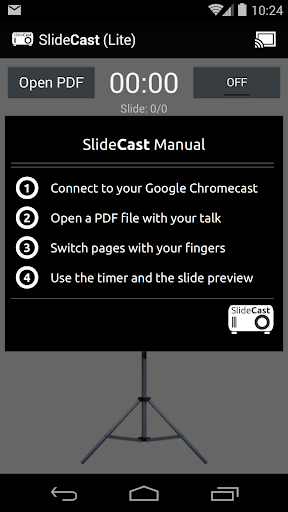 With SlideCast and Google Chromecast you can show your slides in a projector with HDMI port and/or in a TV from any Android device. Forget your PC and cables, just upload your PDF to your mobile and control your slides with your mobile device. This app provides an interface to cast slides and PDF files in general directly to your Chromecast device.