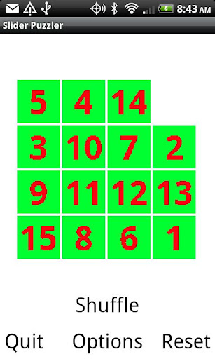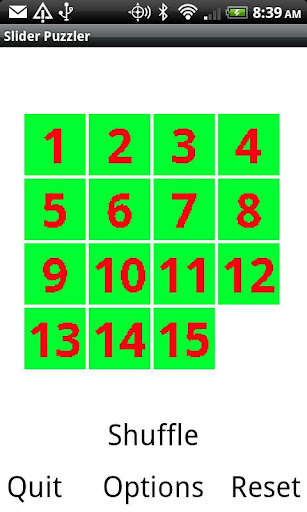 Slider puzzle size ranges from 3x3 to 6x6 are available through the options button.