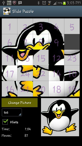 The puzzle has varying levels of difficulty. Start with the 15 puzzle pieces with hints turned on. As you improve and learn the patterns, try the puzzles without hints. Then you are ready for the 24 puzzle piece grid. Use the hints if you need them but the real challenge is to complete the pictures without them. Challenge yourself to better your times and use the least amount of moves at each difficulty level.