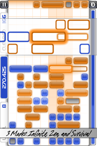 * In Survival Mode, you have 10 seconds to make as many moves as you can to clear the lines of blocks, then a barrage of blocks will drop, and the cycle begins again. Quick thinking and nimble fingers are required to do well.