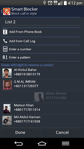 You can create list of contacts and patterns for blacklist or whitelist and can block incoming calls/SMS based on blacklist and whitelist. You can add contact from phone-book, call log or type a phone number with a swipe gesture. Smart search option is there to pick contacts from thousands of contacts you have in your Phonebook or Call Log.