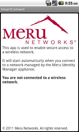 The Meru Networks Smart Connect app allows your wireless settings to be automatically configured to securely connect you to a wireless network.