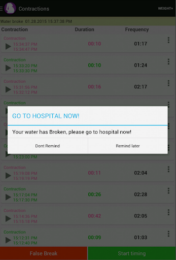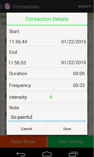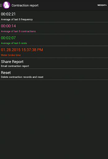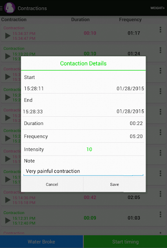 Smart Contraction automatically keeps record of the start/end date and time, contraction duration, and frequency. Tap start timing at the beginning of contraction and tap Stop timing at the end. Tap Report to see summary of contractions records, share report in excel file via email or chat messenger.