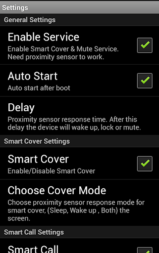 The app settings window allows you to choose each of the above modes. The settings also let you choose to auto start the app on phone boot and the response time of the proximity sensor.