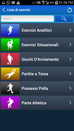 Smart Soccer è diviso in 7 categorie di esercizi: Giochi di Avviamento, Esercizi Analitici, Esercitazioni Situazionali, Partite a Tema, Possessi Palla, Parte Atletica e Giochi di Posizione.