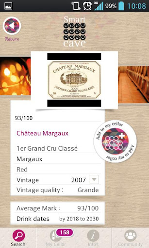 You can looking for wine information on SmartCave database, wine details, current market price, drink dates, SmartCave users and professional reviews and ratings, and the best food and wine pairing.