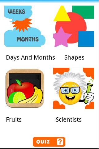 Smartkidz App is designed for pre-primary kids. This App contains numbers, alphabets, fruits, regular shapes, months and weeks and names of some important scientists.Kids can learn alphabets, numbers, shapes, month and week names, fruits and some important innovations. They can take quiz to test their learning also. Quiz is devided into 2 parts. First one is relatively simple, if they perform well in the first quiz, they can take second quiz, which is bit difficult. They can repeat the quiz till they master their learning.