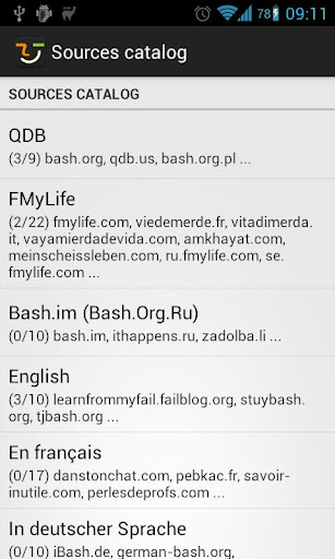 At the moment Smiler can get quotes of such resources as bash.org , qdb.us, fmylife.com,learnfrommyfail.failblog.org, danstonchat.com, ibash.de, german-bash.org,smsvongesternnacht.de, bash.org.ru, ibash.org.ru, ithappens.ru, zadolba.li, ukrbash.org,bash.org.by, killmepls.ru (QDB, LMF, FML, AMK, XKCDB, FMS, Hatepost, IMMD, MMT, TFLN, VDM, DTC, PEBKAC, VMV , KMP, MLA, TFM, TSM, MLIN) and more … (check the full list of resources).