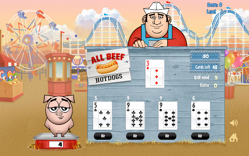 Score bonus points for straights and 5-card charlies and play the Dealer Bonus Game after each round for even more snacks! Progress through as many vendor stands as you can to raise a champion swine, then build a home for your best pigs at Sleepy Wallow farm.