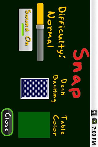 Use the Options screen to change difficulty level to test your reaction time, change the deck backing or even the color of the table.