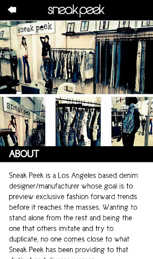 Sneak Peek is a Los Angeles based denim designer/manufacturer whose goal is to preview exclusive fashion forward trends before it reaches the masses. Wanting to stand alone from the rest and being the one that others imitate and try to duplicate, no one comes close to what Sneak Peek has been providing to that distinct and diverse woman.
