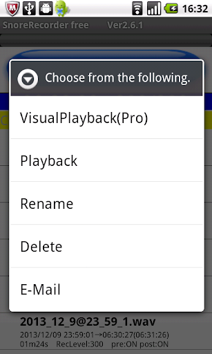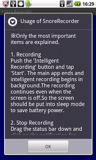 This application is a PCM (WAV) format sound recorder intended to capture sounds (snoring, talking) while sleeping, but it can also be used for other purposes such as recording a voice memo.