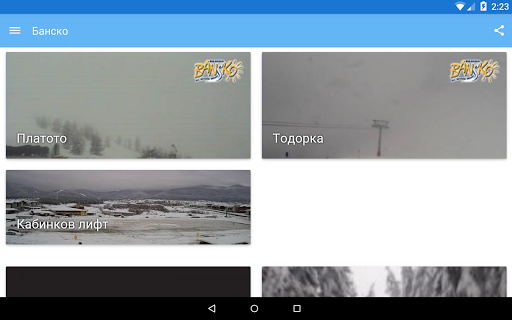 Някои уеб камери може да са временно изключени.Snow ReportBG не отговаря за поддръжката на уеб камерите.Всички условия за ползване са налични в приложението и на сайта snow-bg.com