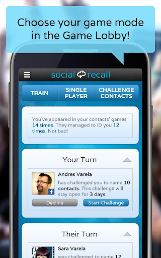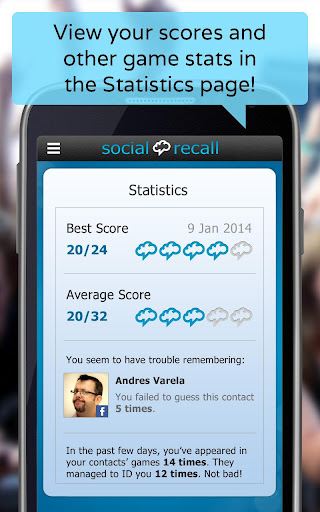 Social Recall is part trivia game, part brain trainer, part bragging tool. Thought up by a social imbecile with no memory for faces, use this game to learn to recognize your contacts, compare your performance and challenge your friends. Download this free brain training quiz, now.